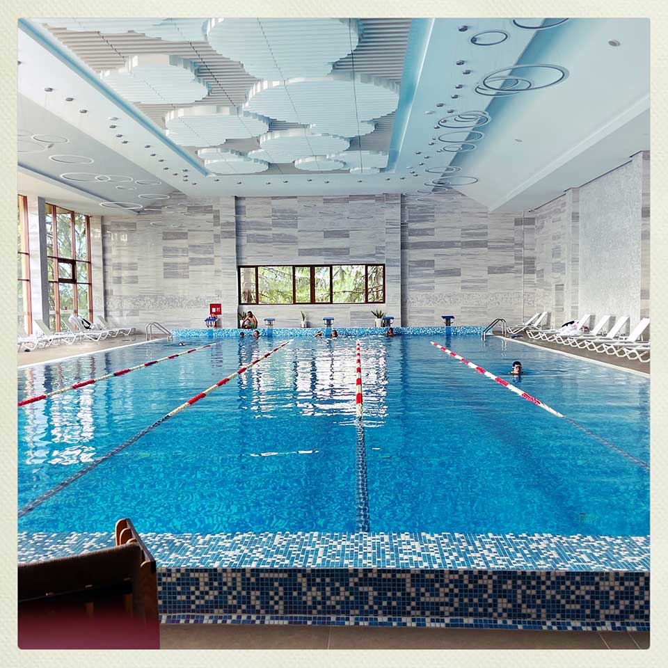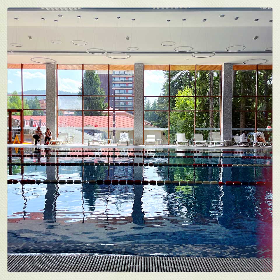 We decide to cut the visit short and head back to Pamporovo and its more benevolent temperatures. We arrive around 16:00 and decide to dive straight into an impromptu stretching/yoga class. And what a pleasure to discover the fabulous spa and 25 meter/5-lane hotel swimming pool.