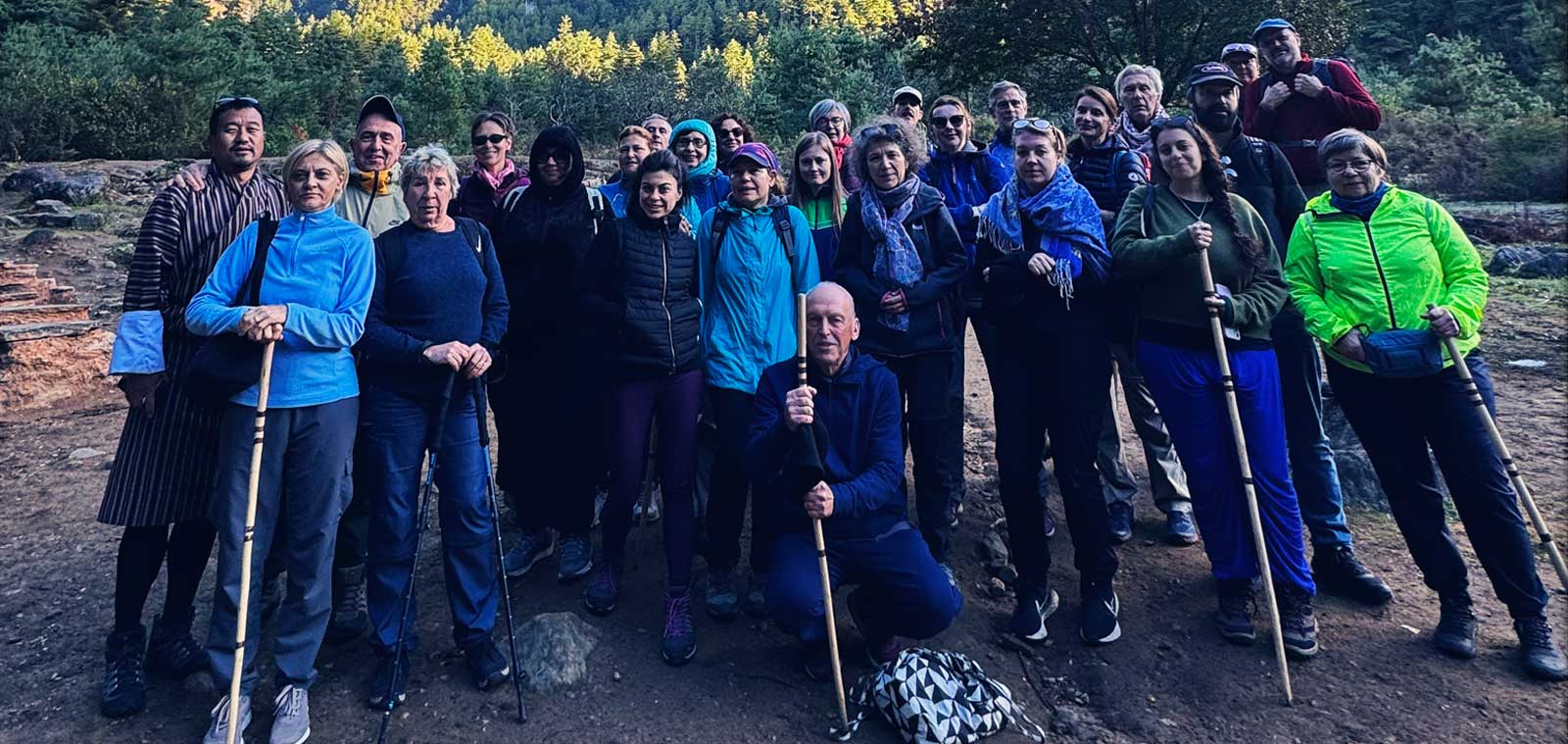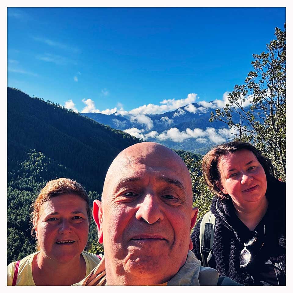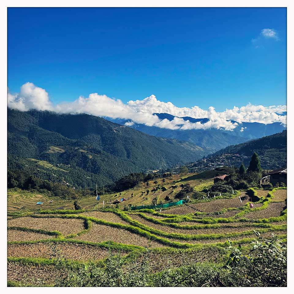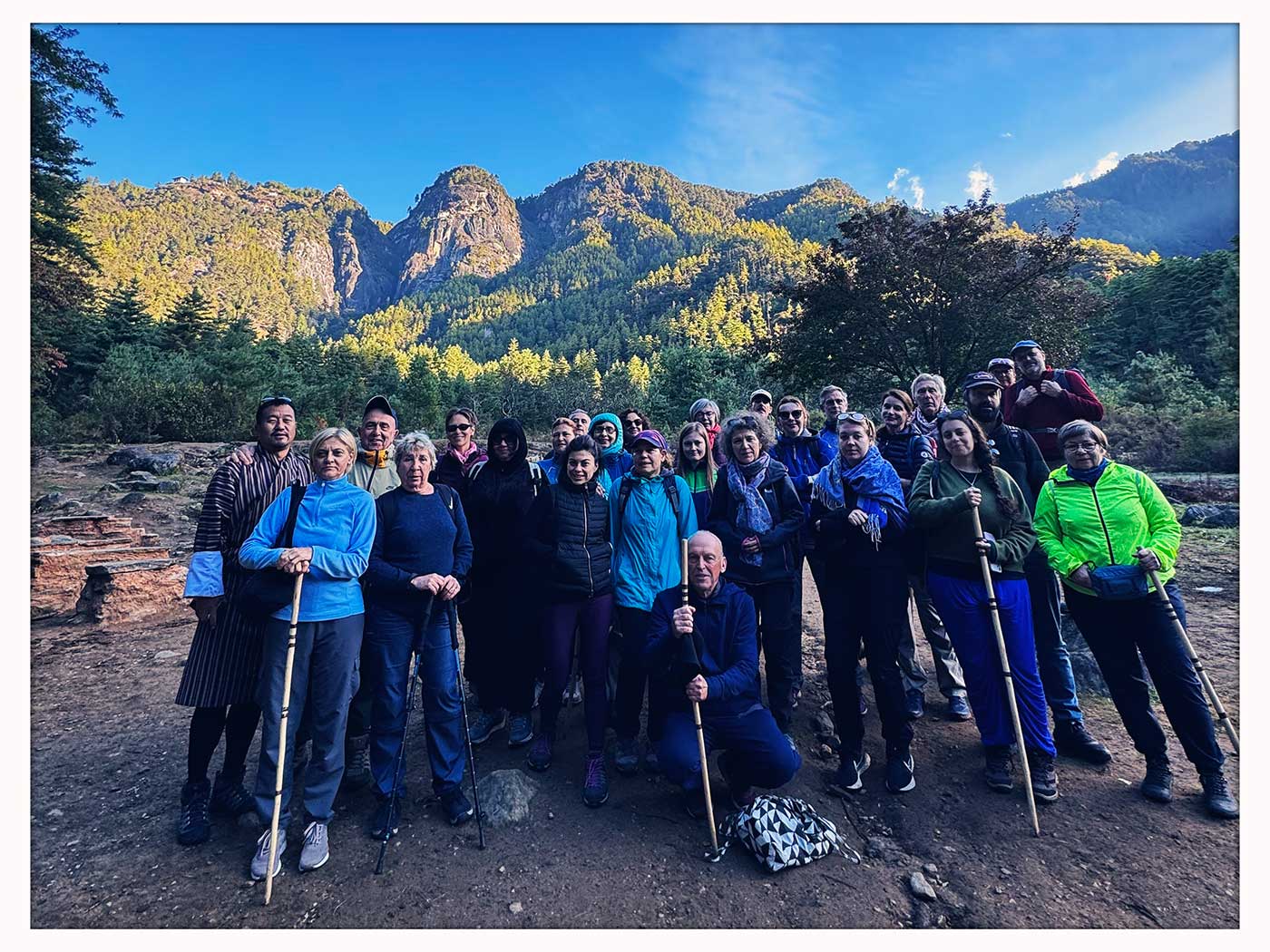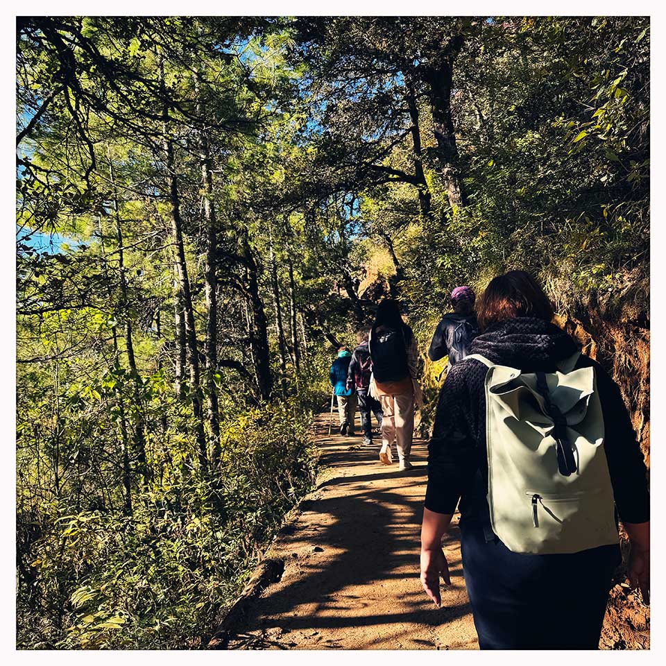 This morning, we set out on a several-hour hike through breathtaking landscapes. The mountains unfold under a nearly unreal clarity, the villages fade behind us, and only the rustle of leaves, the distant song of a stream, and the steady rhythm of our steps remain. Here, Bhutan reveals its purest face, between sky and silence.