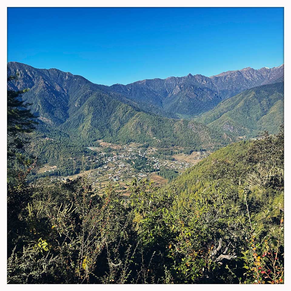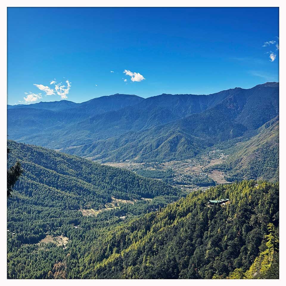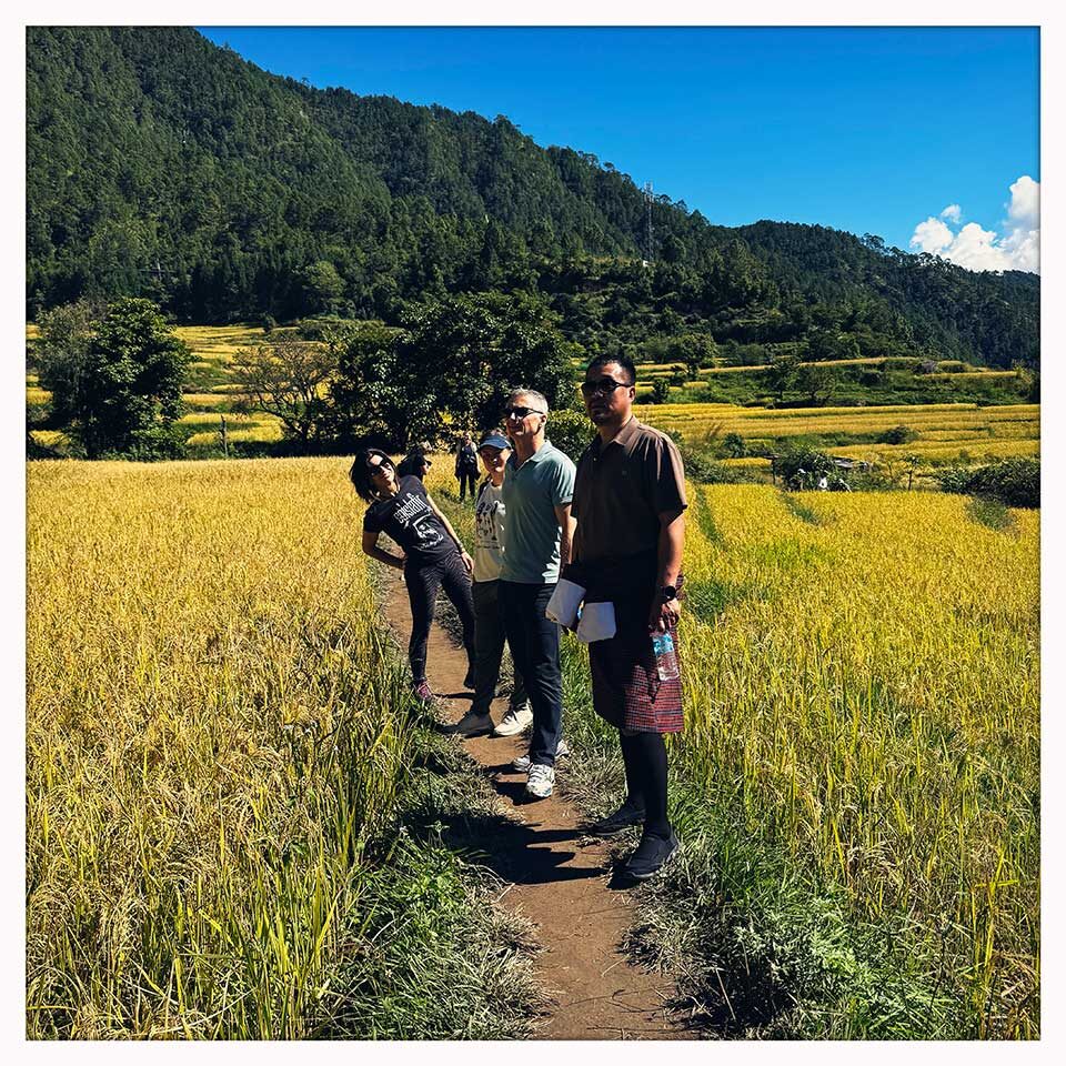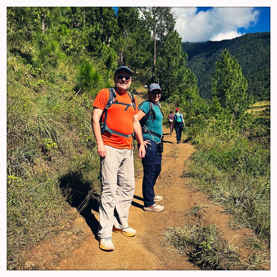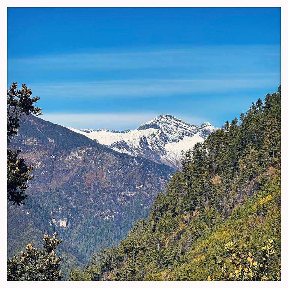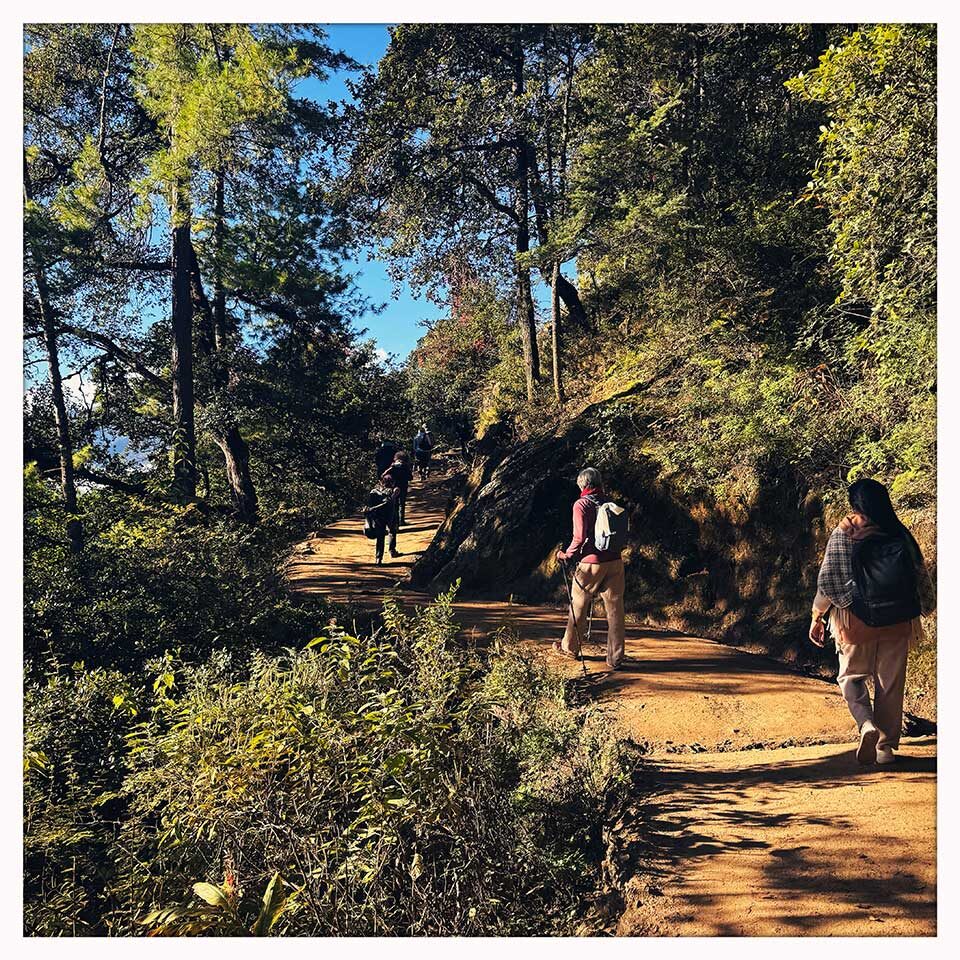 This morning, we set out on a several-hour hike through breathtaking landscapes. The mountains unfold under a nearly unreal clarity, the villages fade behind us, and only the rustle of leaves, the distant song of a stream, and the steady rhythm of our steps remain. Here, Bhutan reveals its purest face, between sky and silence.