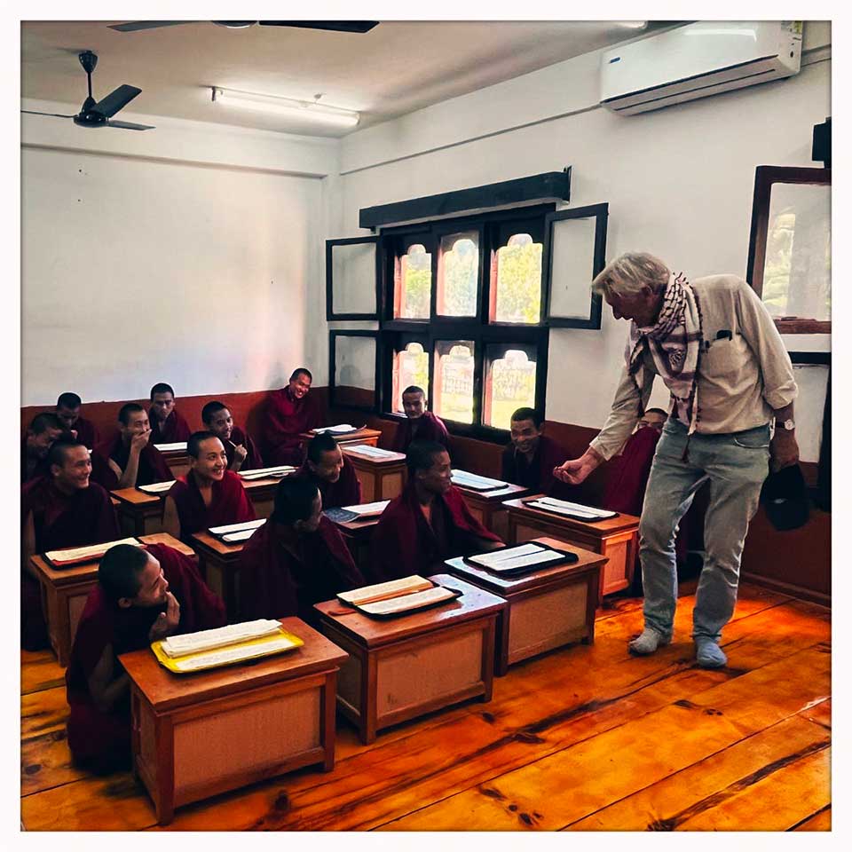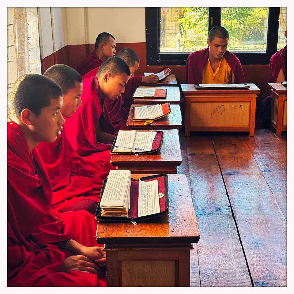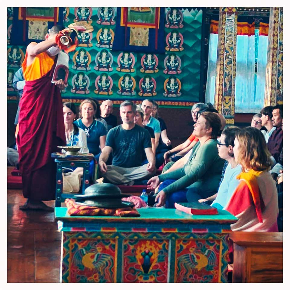 We are then granted the rare privilege of entering a monastic school normally closed to visitors. The master of the monastery welcomes us with kindness and offers us a purification ceremony, a moment of silent intensity filled with respect and gentleness.