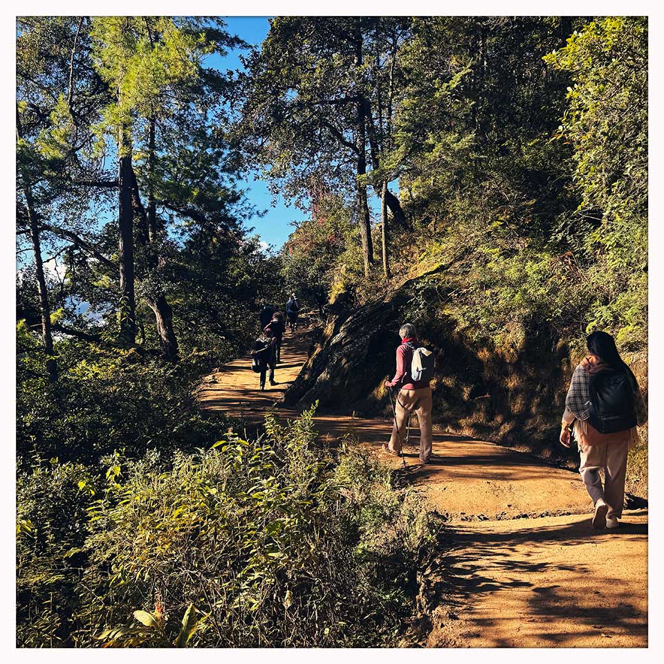 Today is the big day. We set off at dawn for the mythical ascent to the Tiger’s Nest, the Taktsang Monastery, clinging to a cliff more than 3,000 meters above sea level. The morning light warms the peaks, the valley awakens slowly, and already our first steps echo along the path.