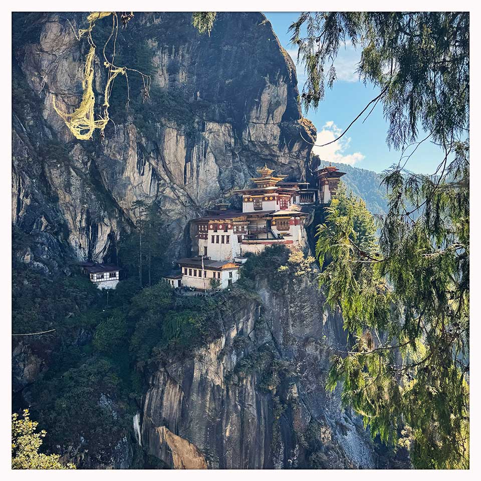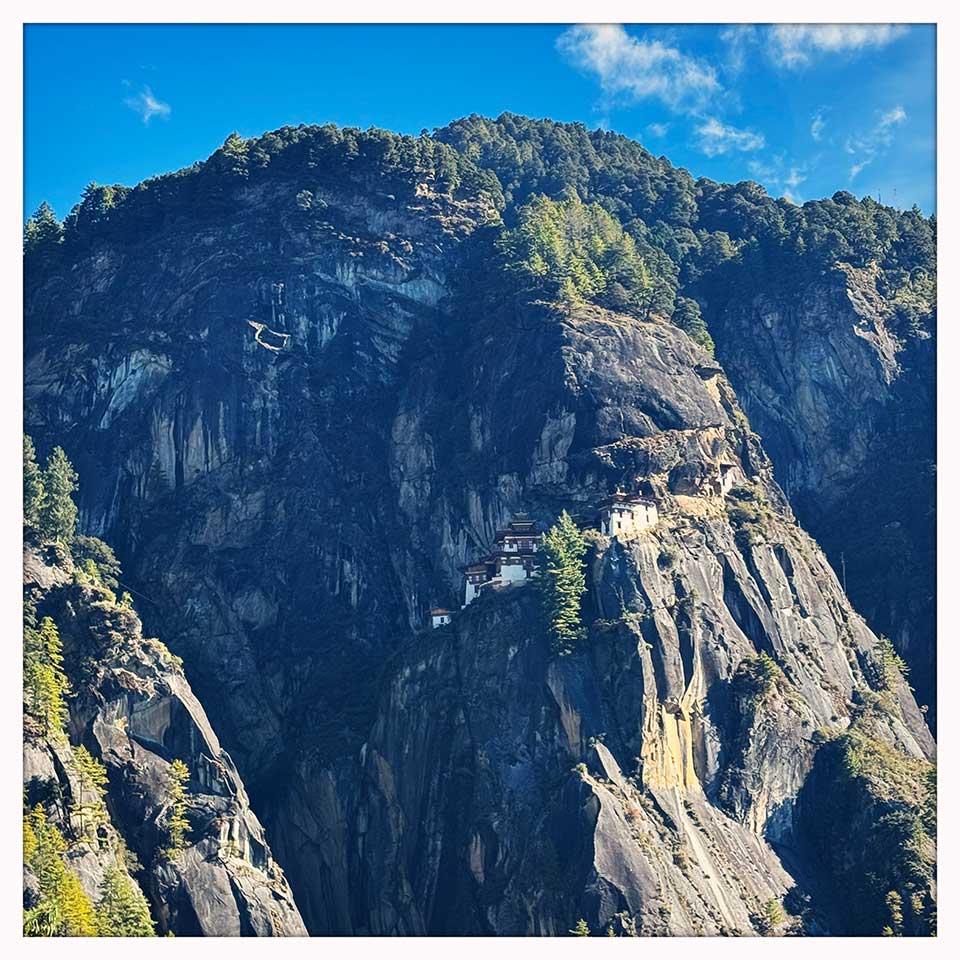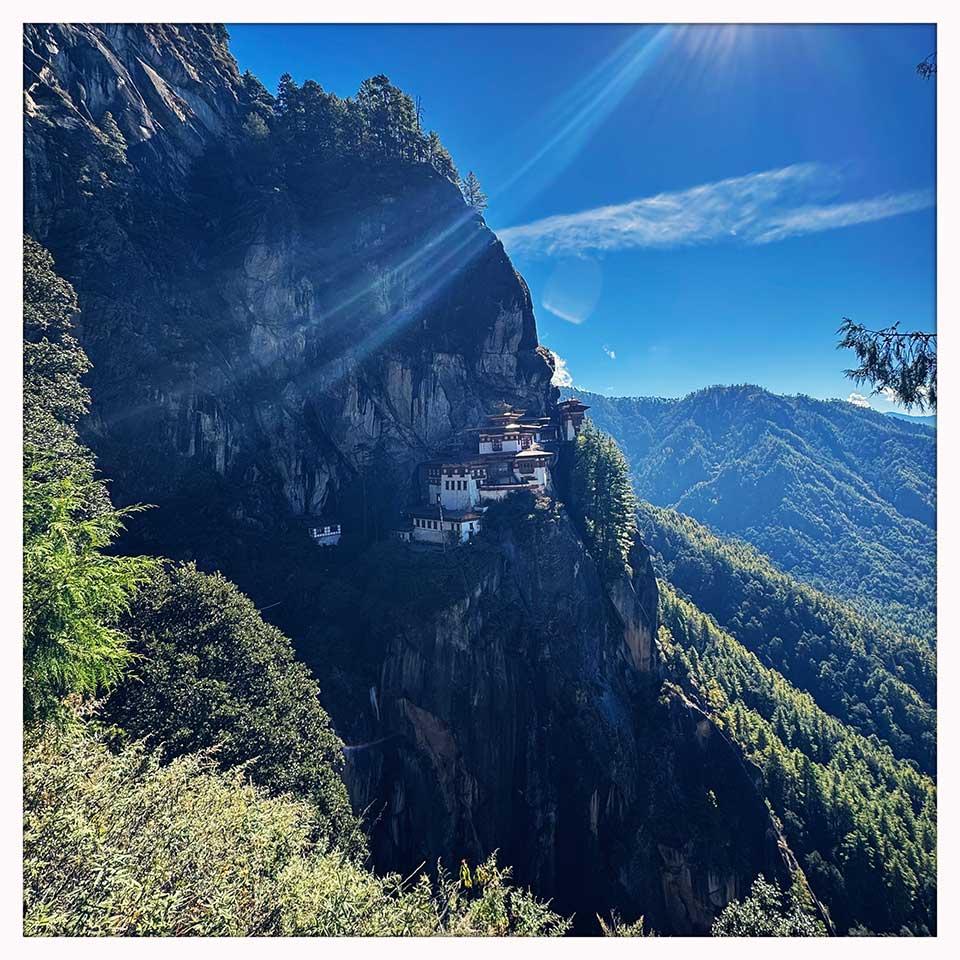The climb is demanding, but each turn offers a breathtaking view: mountains stretching into the mist, prayer flags dancing in the wind, and the monastery slowly revealing itself like a mirage suspended in the air.