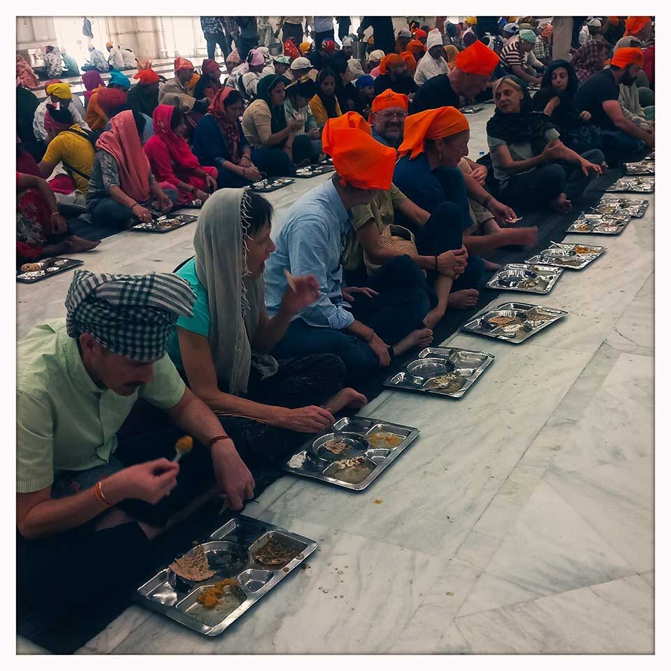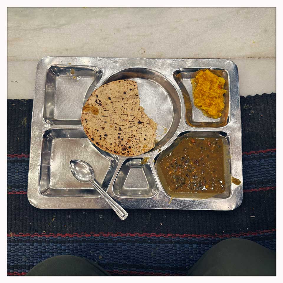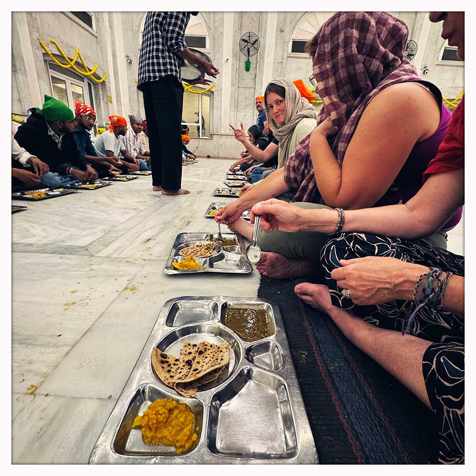 Some stayed a few more days in India, while others prepared to head home. Since our Delhi–Brussels flight left late in the evening, we made the most of these precious hours with a whirlwind visit of the Indian capital. One of the highlights was the Sikh Golden Temple, where we were welcomed in an atmosphere of profound peace. We explored the temple’s immense kitchens, bustling with volunteers preparing thousands of free meals every day for visitors of all backgrounds. After this immersion in the spirit of seva, the selfless service, we ate on site, sitting among the pilgrims and enjoying a simple, warm, deeply human meal. A brief introduction to Sikhism shed light on this generous and egalitarian tradition.